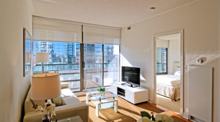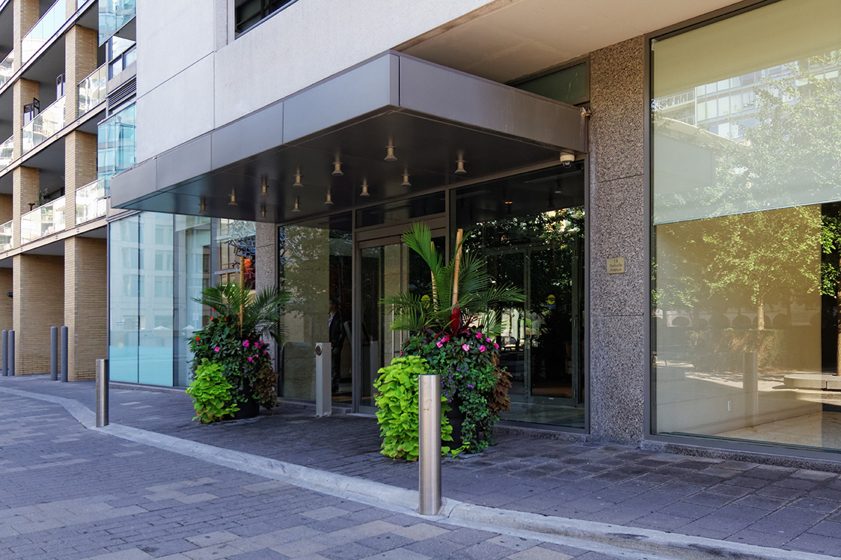 It has a double height lobby and the amenities are located on the eighth floor. Suites feature nine foot ceilings, individually controlled heating and air conditioning, choice of engineered wood floors, 40 oz. carpet with 0.5 inch under pad, chrome finished hardware, double glazed anodized aluminum windows, stacked full sized washer and dryer and an emergency voice communication system. The kitchens have extra-tall cabinetry, choice of granite or laminate counter tops with curved breakfast bars, mirrored backsplash, ceiling mounted halogen track lighting and choice of brand name stainless steel appliances.
